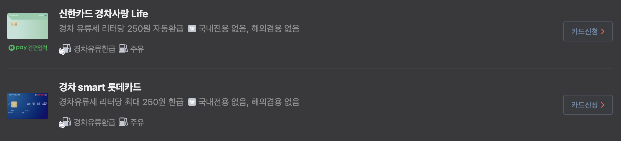 | 신한카드 | 경차사랑 Life | 연 30만 원 | 주유소 리터당 80원 할인, 편의점·병원 10%, 마트 5% 등 |